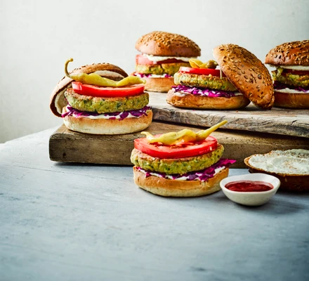 - Mix the hummus, yogurt and some seasoning, then spread on both sides of the toasted buns. Put some cabbage on the bottom buns, top with the burgers, a slice of tomato, a pickled chilli, some hot sauce and the bun tops, and serve.