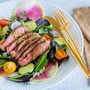 Assemble the green salad with 2 handful salad mix (my Asian greens mix had baby kale, Asian greens, and baby spinach in it), 1 watermelon radish (thinly sliced), 2 red radishes (thinly sliced), ½ English cucumber (sliced), ½–1 avocado (cubed), and 6 cherry tomatoes. You can choose any leafy salad and other salad ingredients you like.