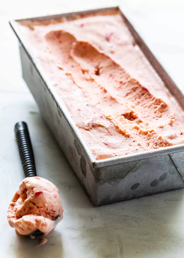 The ice cream can be served immediately if desired. To harden to a scoopable consistency, transfer the ice cream to a loaf pan or other freezer-safe container, press a piece of parchment paper over the top, and cover it with a lid. Place in the freezer for at least 2 hours. When ready, scoop onto your favorite cone.
