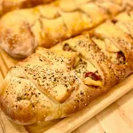 - Beat the egg with 2 tsp water, and using a pastry brush, cover the dough with the egg wash. Sprinkle the dough with sesame seeds or bagel seasoning, if you wish. Toss in the oven, and bake for 14 minutes exactly. Remove from the oven, and cool slightly before slicing. Serve with marinara sauce on the side.