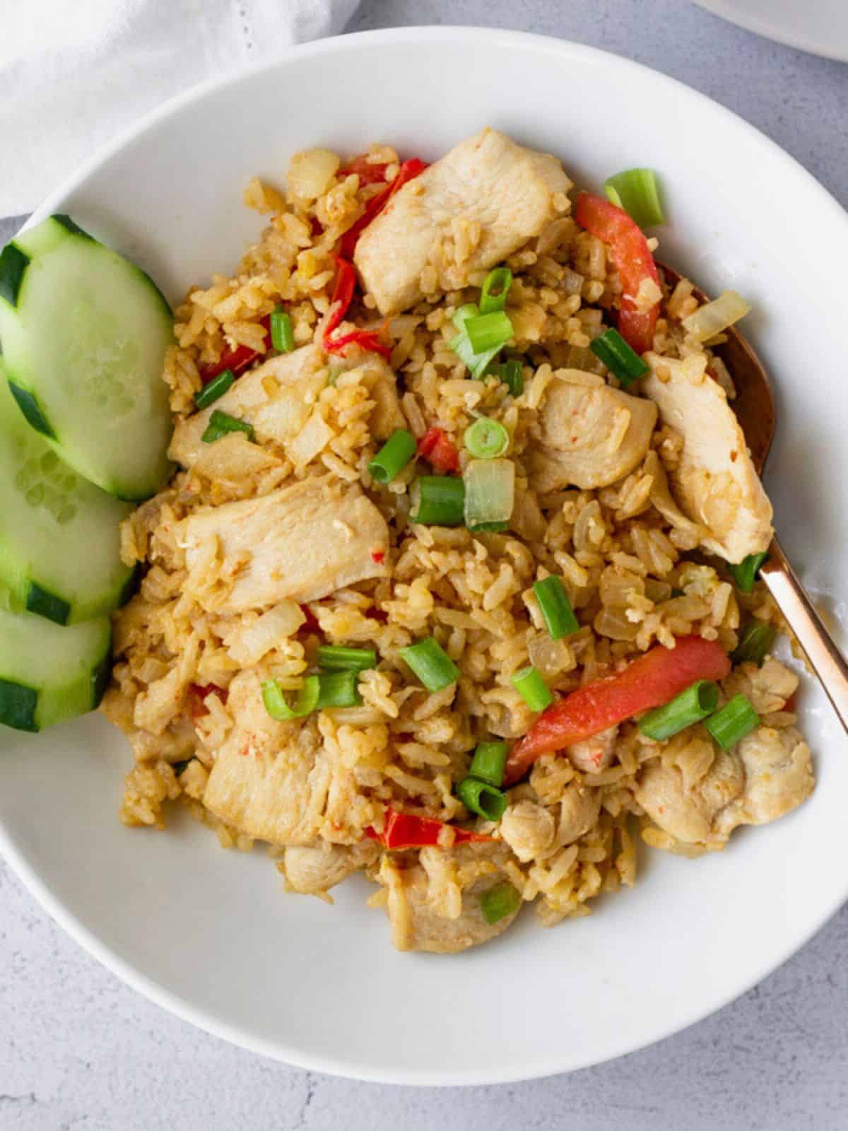 10. Plate the fried rice with sliced cucumbers, green onions, and the prik nam pla on the side.