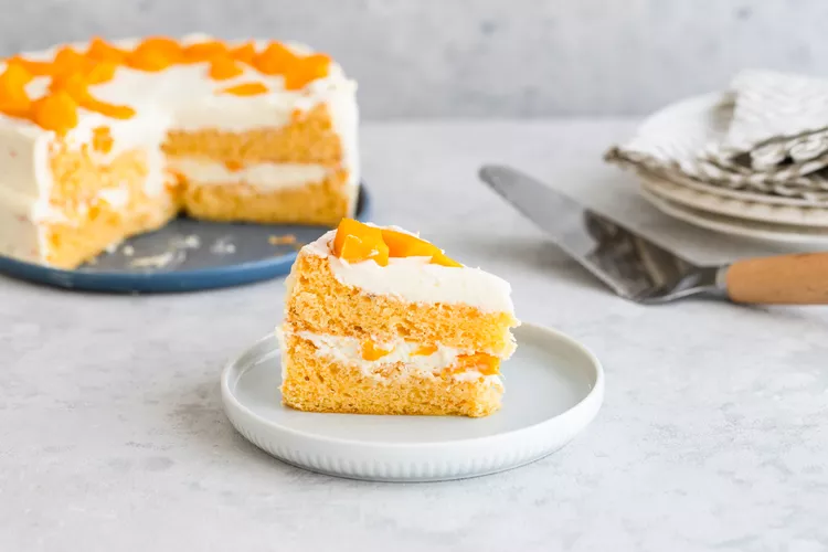 - Gently remove the cakes from the pans. Place 1 cake on a plate and spoon over some cream to create a layer of about 1/2 to 1-inch in thickness. Top with half of the diced mango.