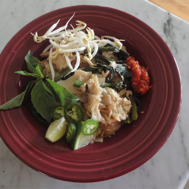 Place the dry rice noodles in a bowl, cover with hot water, and let soak until white and soft but not mushy, about 10 minutes. Drain and set aside.