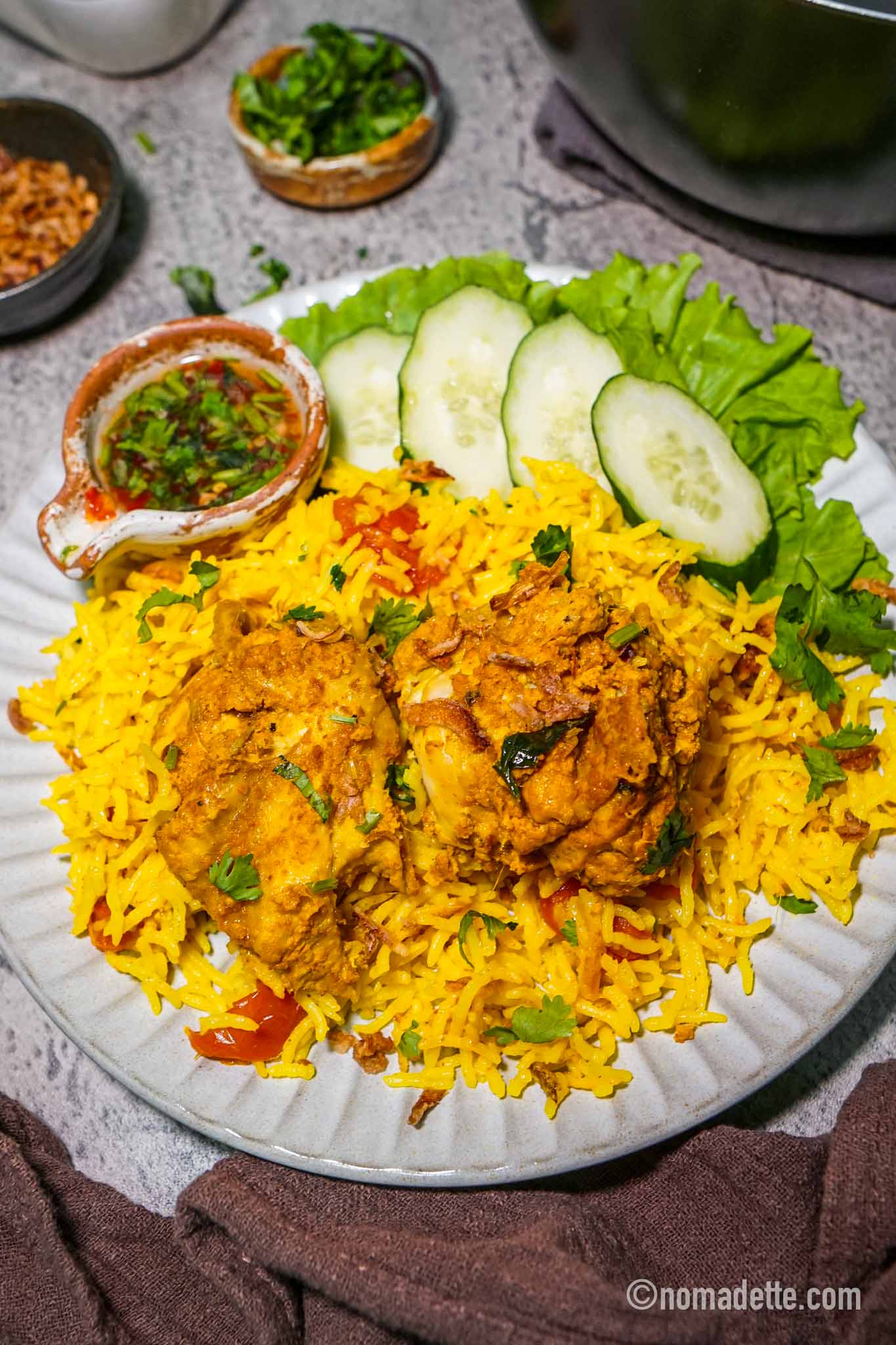 10. When the chicken is ready, transfer a few heaped scoops of rice to serving plates, arrange the chicken and gravy on top of the rice, sprinkle with crispy shallots, and serve with the cucumber quick pickle and a dish of Thai sweet chilli sauce.