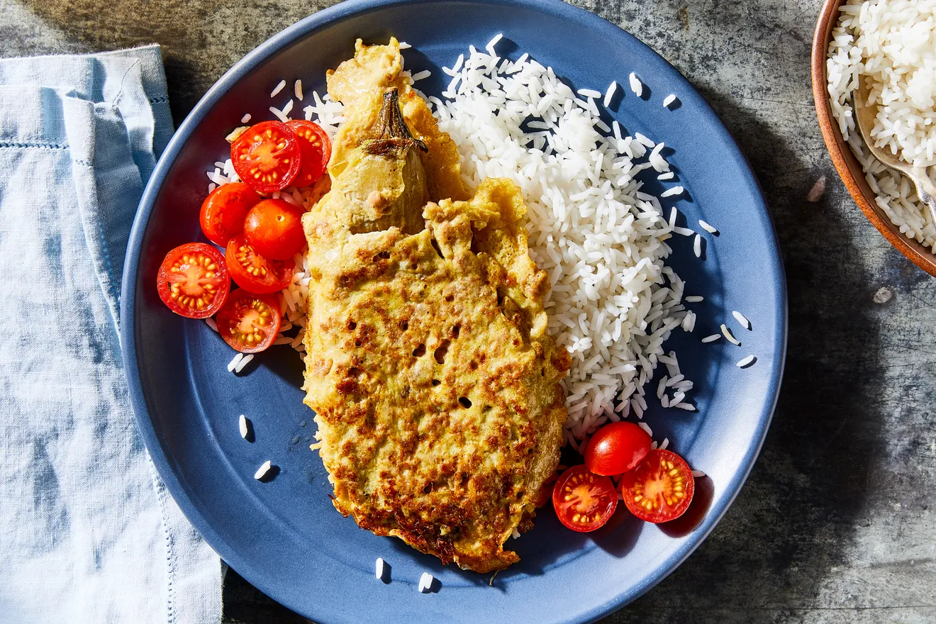 - Make the omelets: In a small bowl, beat 1 egg. In a larger, separate bowl, beat the remaining 3 eggs and combine with the pork mixture. Take one eggplant and dip into the single beaten egg so both sides are coated. In the same pan used for the pork, heat 2 tbsp oil over medium heat. Add the egg-soaked eggplant, then spoon 1/4 of the pork/egg mixture over the top. Season with salt and pepper. Cook for 3 minutes on one side, or until the bottom of the eggplant has set. Drizzle a bit more egg over the top of the eggplant, then flip over and cook about 1.5 minutes on the other side. Set aside on a serving plate. Repeat with remaining eggplants. Serve with white rice.