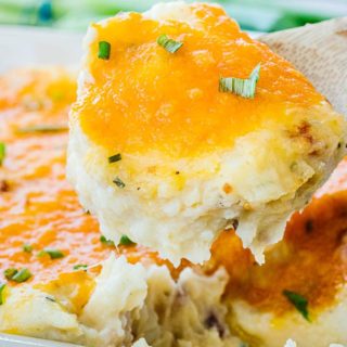 This recipe freezes well- pour the mashed potato mixture into a freezer-safe container and top with cheese. Allow to cool to room temperature, then cover and wrap in foil or plastic wrap. When you’re ready to cook, remove from the freezer and bake covered with foil in a preheated 375º oven for approximately 45-60 minutes, uncovering the last 10 minutes.