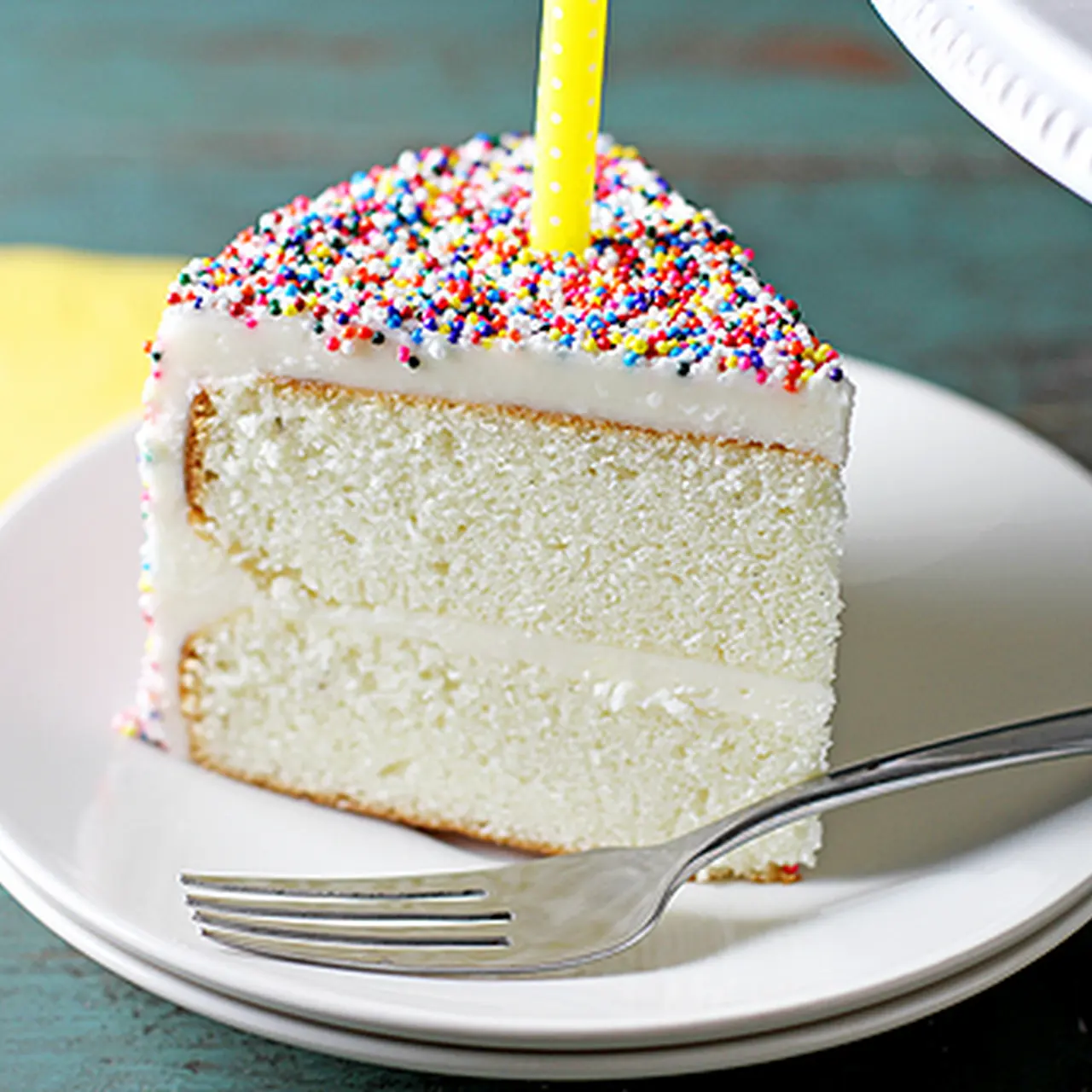 9. Use a serrated knife to trim domed tops of fully cooled cakes to create a flat surface. Place one cake, cut-side up, on a cake stand or serving plate. Use an offset spatula to frost top of cake. Top with second cake, cut-side down. Frost sides and top of cakes. Decorate with nonpareil sprinkles, if desired.