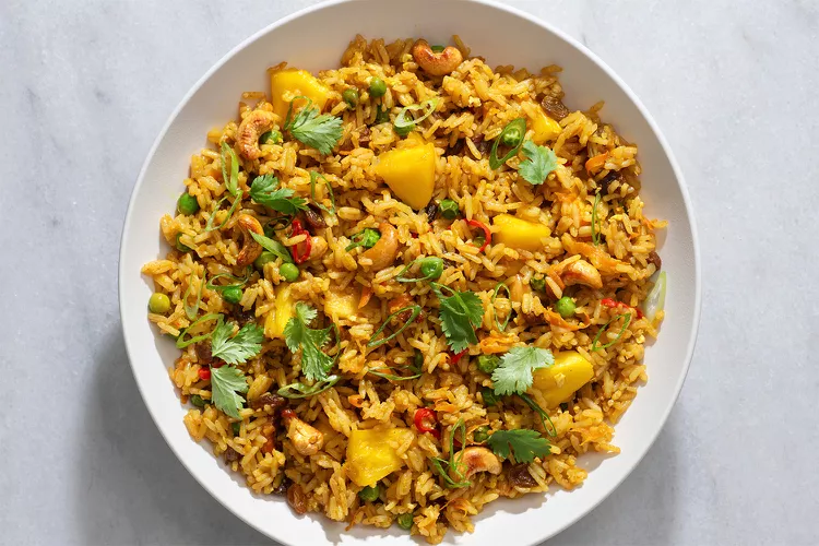 Add the rice, pineapple chunks, currants, and cashews. Mix well to incorporate all ingredients.