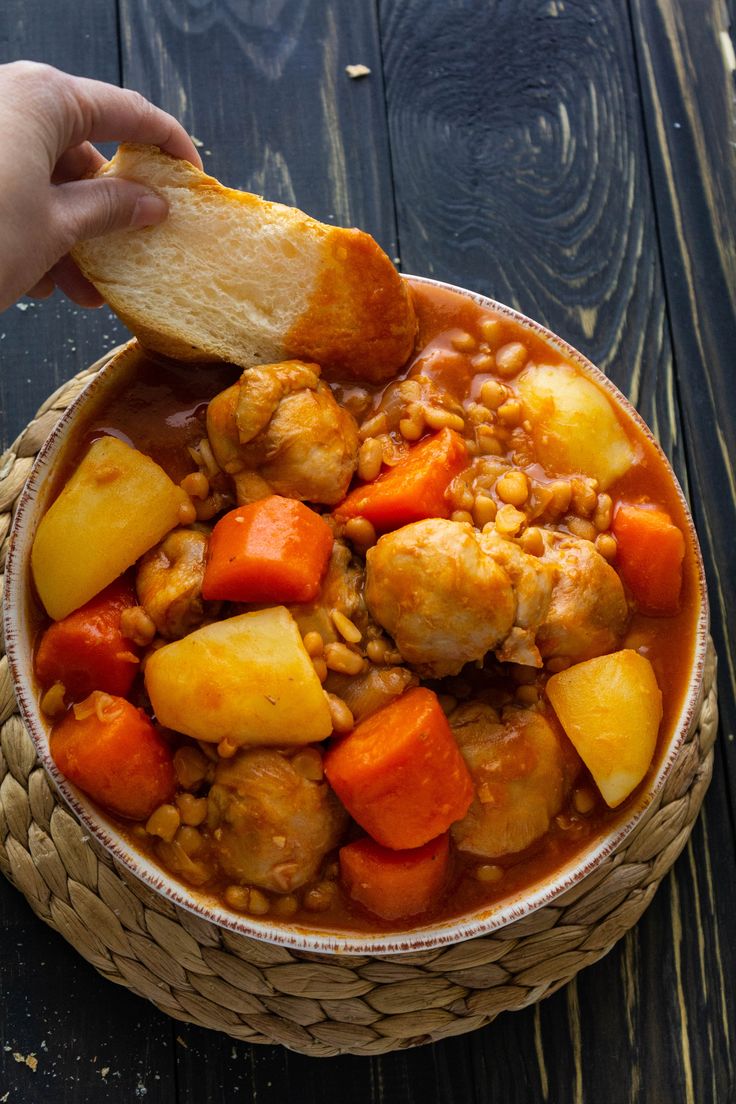 - Remove the lid, add the potatoes, carrots and bay leaf. Pour in the chicken broth and if needed, water to cover about 80 percent of the chicken and vegetables. Increase the heat to bring to a boil, then turn down the heat to gently simmer. Cover and cook until the potatoes are easily pierced with the tip of a knife 5 to 10 minutes.