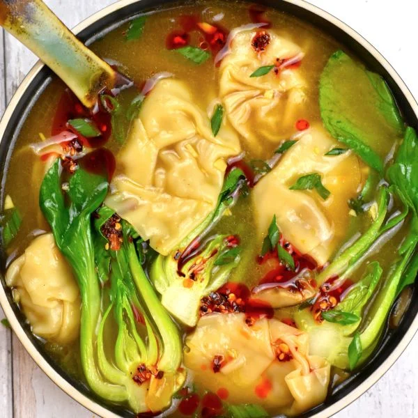 - Serve the broth in bowls with wontons and bok choy, and garnish with scallions and chili oil.