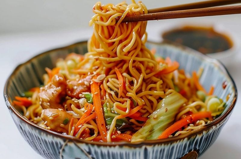 - Increase the heat to high and mix in the remaining soy sauce, cooked noodles, and chicken mixture for 1 minute or until combined. Serve and enjoy!
